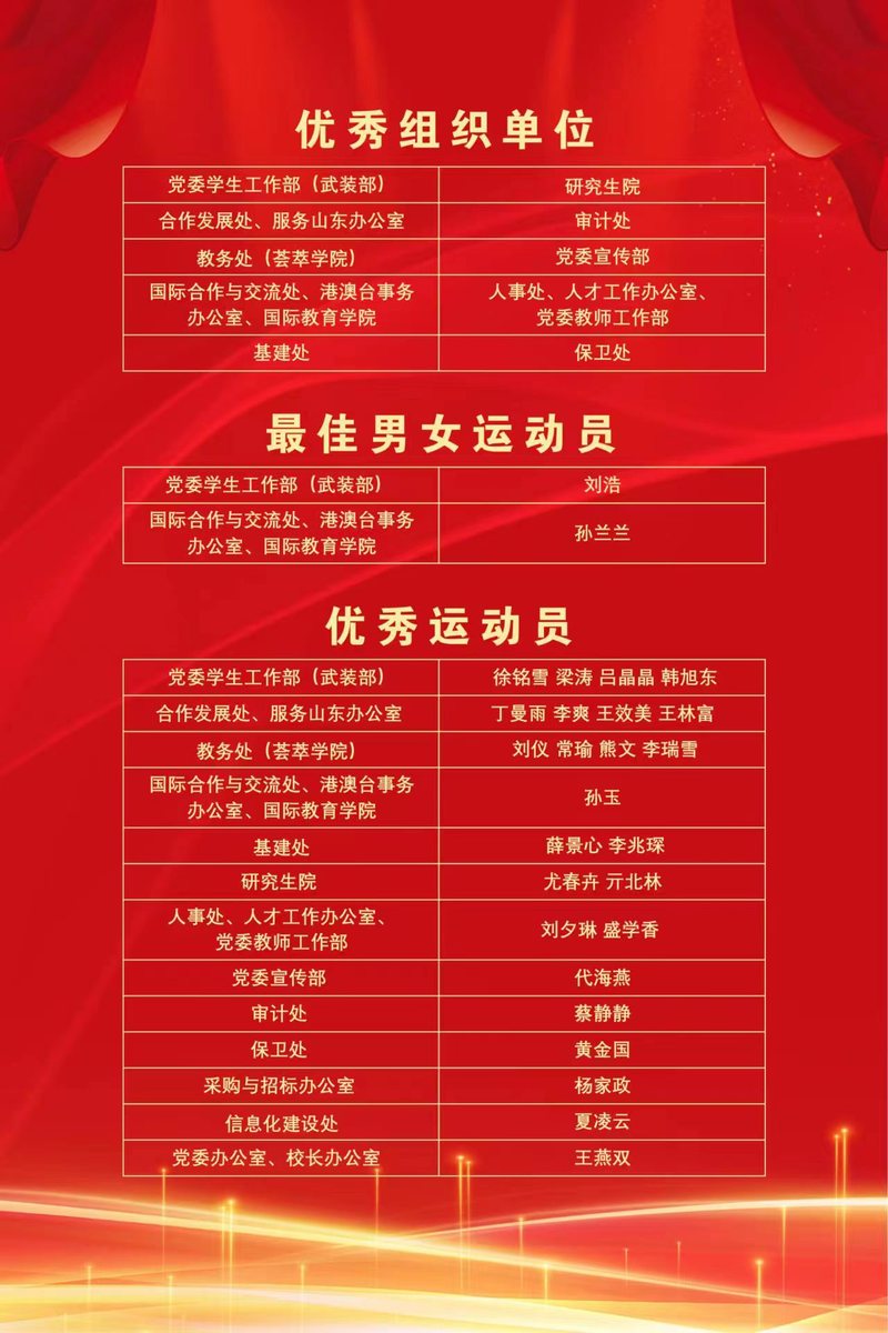 5月12日-13日,学校2023年运动会在田径场上隆重举行,来自全校的37支代表队参加了比赛。最终,校机关代表队以208.5分的成绩夺得教职工团体总分第一名。本次运动会,人事处、人才办、教工部共派出6名运动员分别参加竞技项目、入场方阵、太极拳表演及趣味运动项目,在团体项目和个人项目中均取得了优异成绩。
